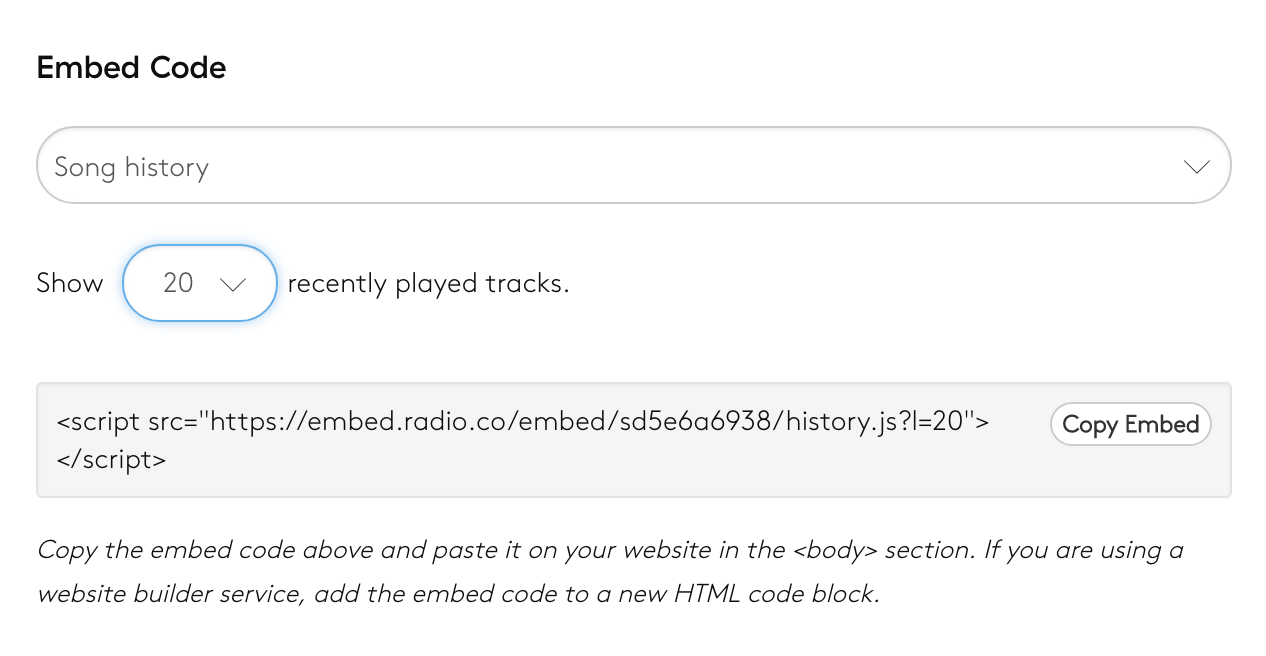 Show your listeners what has recently played using the improved Sony History embed, available in Listen > Embed Codes. A simple drop down menu lets you choose how long the list of tracks will be. You can choose 5, 10, 15 or 20 tracks from the available options.