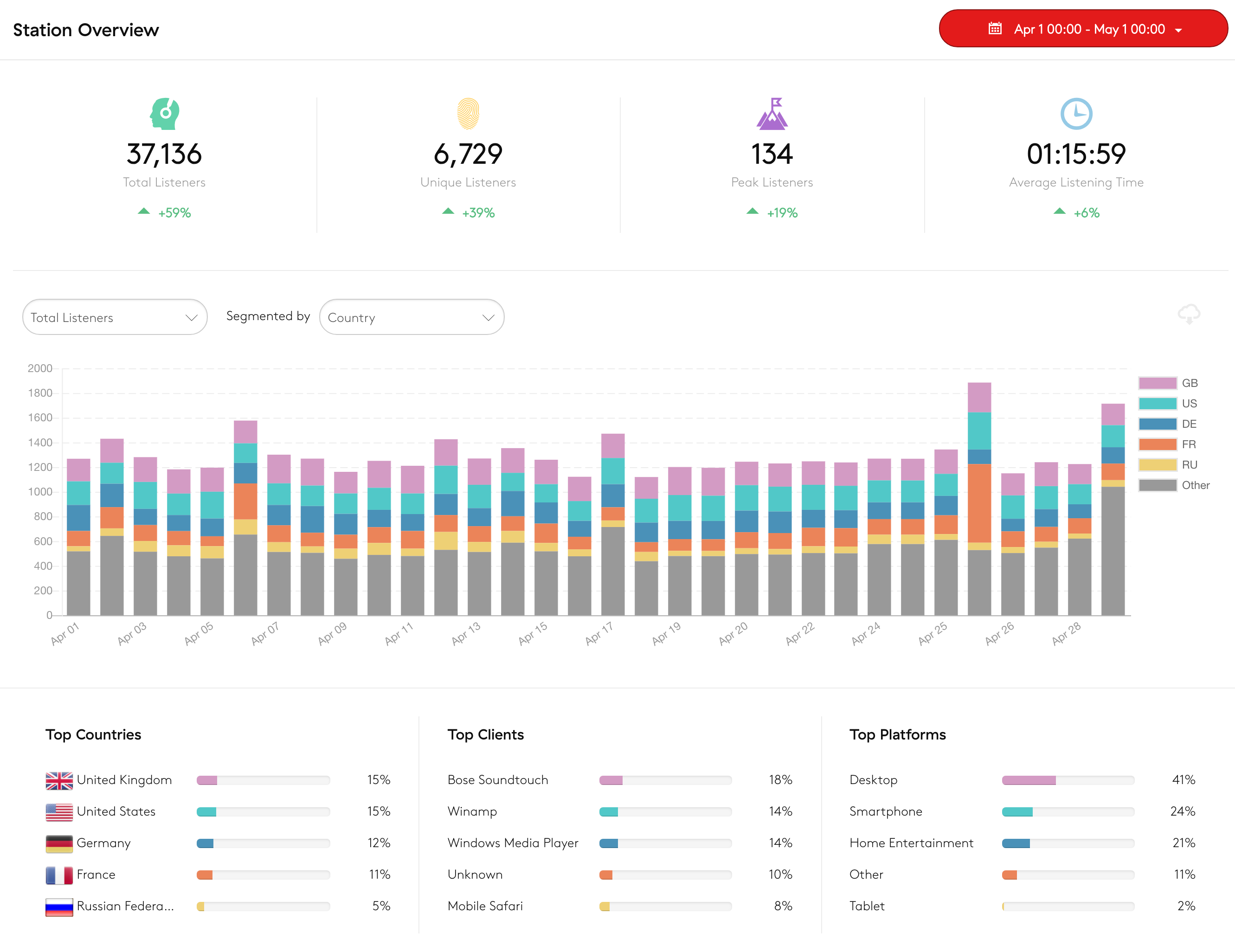 Accurately measure your listenership and use the powerful filtering options to gain deeper insights, using the new Overview section. Here you’ll find details about your listeners, from any time period within the past 62 days. Has a DJ asked you how popular their show was? No problem - just dial in the time and date of their show and quickly see how many listeners they had.
