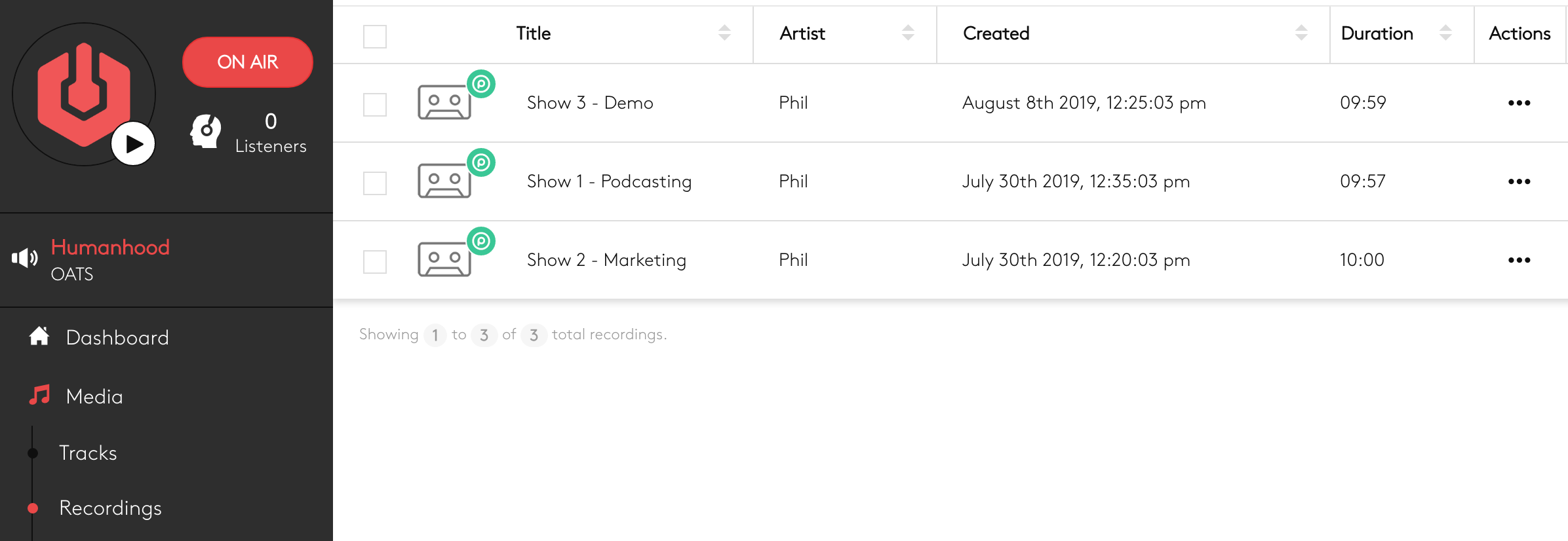 When each of your live shows has finished recording it can be found in the ‘Recordings’ section underneath your ‘Media’ tab. By clicking on the options button (aka the 3 dots) you'll have the ability to ‘Upload to Podcast.co’, and from here you’ll be able to name your episode, give it a brief description and most importantly upload that radio show onto your podcast account.