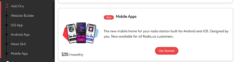 You can order your apps for both iPhone or Android in the by clicking "Get Started" button next to Mobile Apps, found in the Radio.co Dashboard under the Add Ons section. If you're on the Radio.co Plus or Premium plan, the iOS & Android Apps are included. For Standard and Lite plans, the apps can be added on as extras.